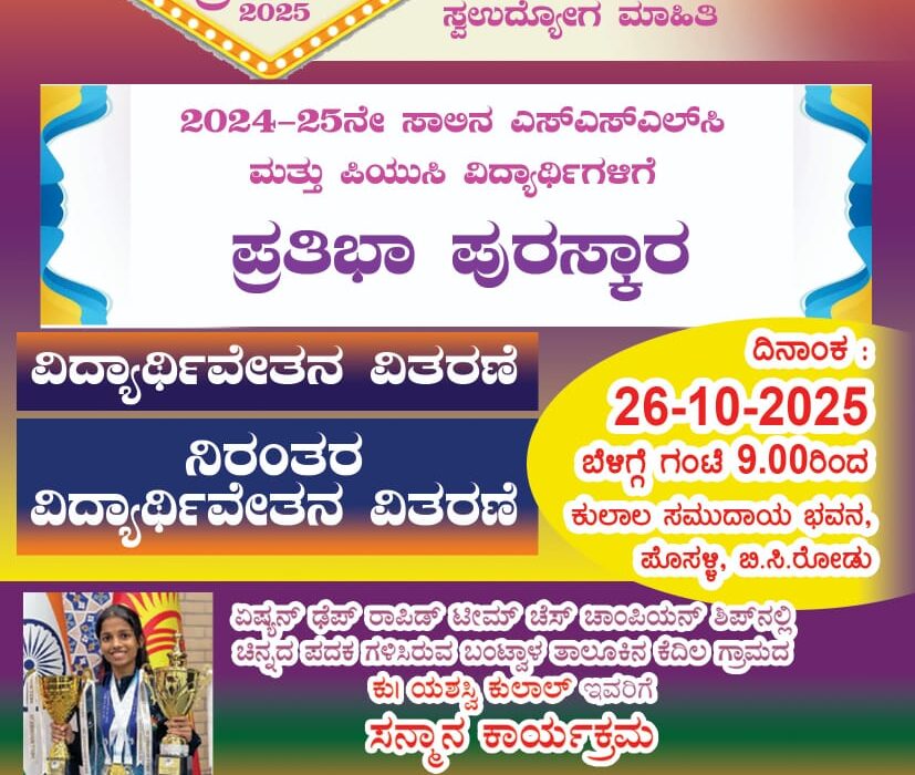 ಬಂಟ್ವಾಳ : ಬಂಟ್ವಾಳ ತಾಲೂಕು ಕುಲಾಲ ಸುಧಾರಕ ಸಂಘದ ವತಿಯಿಂದ ಅಕ್ಟೋಬರ್ 26ರಂದು ಬಿ.ಸಿ.ರೋಡಿನ ಪೊಸಳ್ಳಿ ಕುಲಾಲ ಭವನದಲ್ಲಿ ‘ಯುವ ಪ್ರೇರಣೆ – 2025 ಬ್ಯಾಂಕಿಂಗ್ ಸಾಲ ಮತ್ತು ಸ್ವಉದ್ಯೋಗ ಮಾಹಿತಿ ಕಾರ್ಯಾಗಾರ’ ನಡೆಯಲಿದೆ. ಸಂಪನ್ಮೂಲ ವ್ಯಕ್ತಿಗಳಾಗಿ ಕೆನರಾ ಬ್ಯಾಂಕ್ ಬಿ.ಸಿ.ರೋಡು ಶಾಖೆಯ ಸೀನಿಯರ್ ಬ್ರಾಂಚ್ ಮೆನೇಜರ್ ಪುರಂದರ, ಉದ್ಯಮಿ ಎಸ್. ಗಂಗಾಧರ, ಸಮಾಜ ಸೇವಾ ಸಹಕಾರಿ ಸಂಘದ ಪ್ರಧಾನ ವ್ಯವಸ್ಥಾಪಕ ಭೋಜ ಮೂಲ್ಯ ಆಗಮಿಸಲಿದ್ದಾರೆ. ನಂತರ ಎಸ್.ಎಸ್.ಎಲ್.ಸಿ. ಮತ್ತು ಪಿಯುಸಿ ಪರೀಕ್ಷೆಯಲ್ಲಿ ಅತ್ಯಧಿಕ ಅಂಕ ಪಡೆದ…