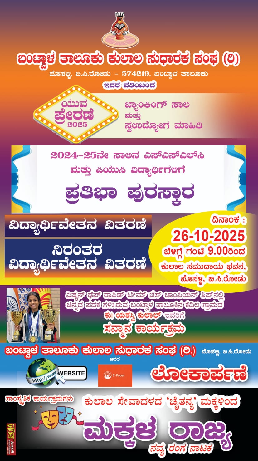 ಅಕ್ಟೋಬರ್ 26ರಂದು ಬಿ.ಸಿ.ರೋಡಿನ ಪೊಸಳ್ಳಿಯಲ್ಲಿ ‘ಯುವ ಪ್ರೇರಣೆ – 2025’ಪ್ರತಿಭಾ ಪುರಸ್ಕಾರ, ನಿರಂತರ ವಿದ್ಯಾರ್ಥಿ ವೇತನ