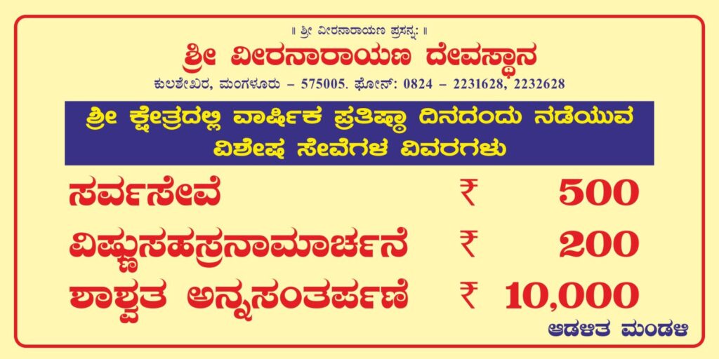 ಶ್ರೀ ಕ್ಷೇತ್ರದಲ್ಲಿ ಪ್ರತಿ ತಿಂಗಳ 2ನೇ ಶನಿವಾರ ಮತ್ತು ತಿಂಗಳ ಹುಣ್ಣಿಮೆಯಂದು ಮಧ್ಯಾಹ್ನ ಸಾಮೂಹಿಕ ಅನ್ನ ಸಂತರ್ಪಣೆ ಜರಗುತ್ತಿದ್ದು, ಭಕ್ತಾಭಿಮಾನಿಗಳಾದ ತಾವೆಲ್ಲರೂ ಶಾಶ್ಚತ ಅನ್ನ ಸಂತರ್ಪಣೆ ನಿಧಿ ಯೋಜನೆಯಡಿಯಲ್ಲಿ ರೂ.10,000/- ವನ್ನು ನೀಡಿ ಶಾಶ್ಚತ ಅನ್ನ ಸಂತರ್ಪಣೆಯ ಸೇವೆಯನ್ನು ಮಾಡಬೇಕಾಗಿ ಶ್ರೀಕ್ಷೇತ್ರದ ಪರವಾಗಿ ಈ ಮೂಲಕ ಪ್ರಾರ್ಥಿಸುತ್ತಿದ್ದೇವೆ. ಅದೇ ರೀತಿ ವಾರ್ಷಿಕ ಪ್ರತಿಷ್ಠಾ ಮಹೋತ್ಸವದ ಕೆರೆಯೋಲೆಯನ್ನು ಲಗ್ತಿಕರಿಸಿರುತ್ತೇವೆ ಆತ್ಮೀಯವಾಗಿ ಸ್ವಾಗತಿಸುವ ಆಡಳಿತ ಮಂಡಳಿ.