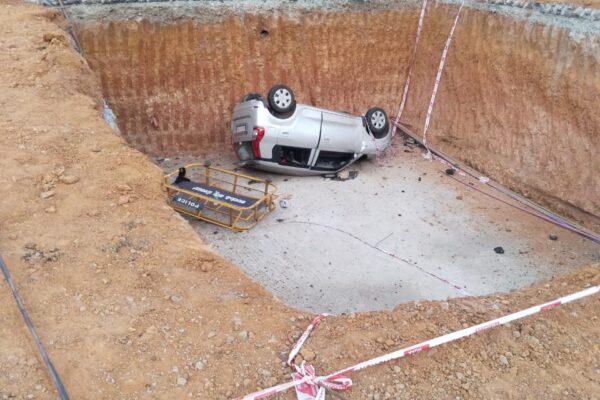 ಉಡುಪಿ: ಮೇಲ್ಸೇತುವೆ ಕಾಮಗಾರಿ ವೇಳೆ ಅಗೆದಿದ್ದ ಗುಂಡಿಗೆ ಮಗುಚಿಬಿದ್ದ ಕಾರು