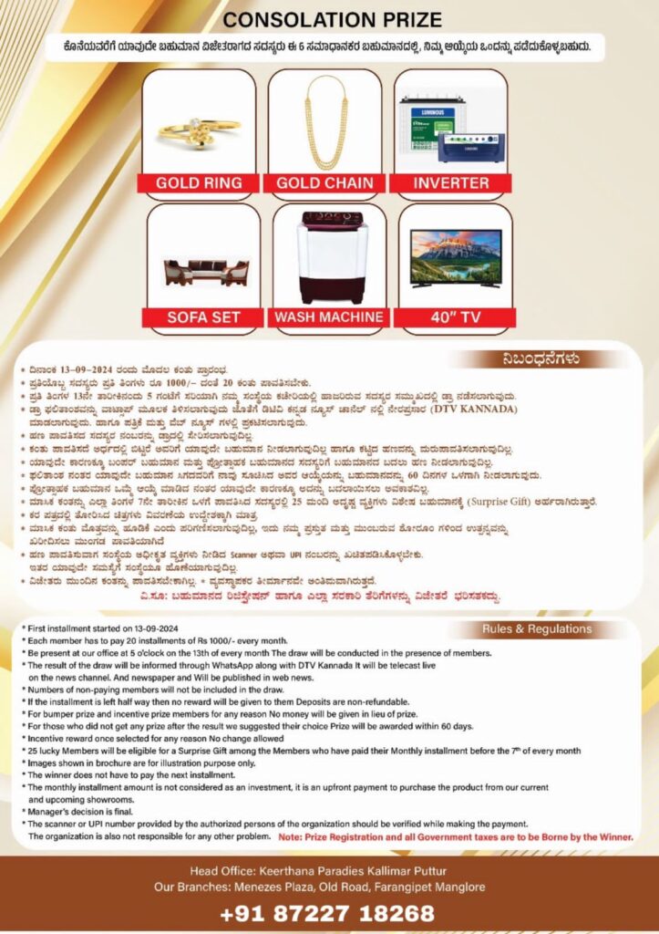 ಇನ್ನು 20 ಡ್ರಾ ಆಗಿಯೂ ತಮ್ಮ ಹೆಸರು ಬಂದಿಲ್ಲ ಅಂದ್ರೂ ನೀವು ಕಟ್ಟಿದ ಹಣಕ್ಕೆ ಅದೇ ಮೌಲ್ಯದ ಮೇಲಿನ ಪೋಸ್ಟರ್ ಗಳಲ್ಲಿ ತೋರಿಸಿದಂತೆ ಅತ್ಯಾಕರ್ಷಕ ಬಹುಮಾನಗಳನ್ನು ತಾವೇ ಆಯ್ಕೆ ಮಾಡಿ ಪಡೆದುಕೊಳ್ಳಬಹುದು.