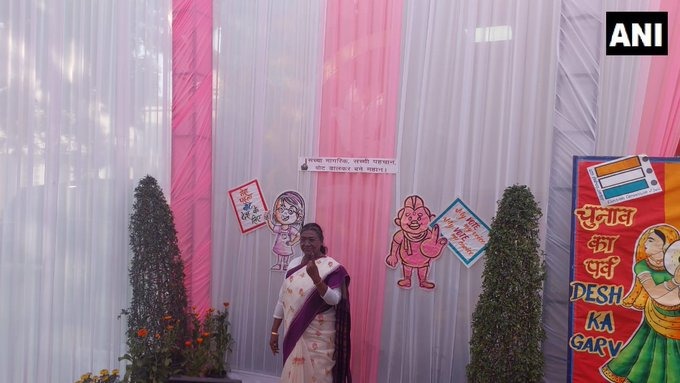 ರಾಷ್ಟ್ರಪತಿ ದ್ರೌಪದಿ ಮುರ್ಮು ಅವರು ಮತ ಚಲಾಯಿಸಿದ ನಂತರ, ರಾಷ್ಟ್ರಪತಿ ಎಸ್ಟೇಟ್ನ ಡಾ. ರಾಜೇಂದ್ರ ಪ್ರಸಾದ್ ಕೇಂದ್ರೀಯ ವಿದ್ಯಾಲಯದಲ್ಲಿ ತಮ್ಮ ಶಾಯಿ ಹಚ್ಚಿದ ಬೆರಳನ್ನು ತೋರಿಸಿದ್ದಾರೆ.