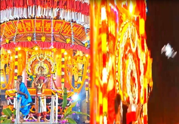 ನಿನ್ನೆ ವಿಟ್ಲ ಪಂಚಲಿಂಗೇಶ್ವರ ದೇವರ ಮಹಾರಥೋತ್ಸವ ವಿಜೃಂಭಣೆಯಿಂದ ನಡೆದಿದೆ. ಈ ವೇಳೆ ವಿಡಿಯೋ ಮಾಡಲು ಹಾರಿಸಿದ ಡ್ರೋನ್ ಒಂದು ರಥದ ಹತ್ತಿರ ಬಂದು ಅಲ್ಲಿ ನಿಂತಿದ್ದ ಅರ್ಚಕರ ತಲೆಗೆ ಬಡಿದಿದೆ. ಈ ವೇಳೆ ದೇವರ ಮೂರ್ತಿ ಹೊತ್ತ ಮುಖ್ಯ ಅರ್ಚಕರು ರಥದ ಮೇಲೆ ತೆರಳಿದ್ದರು. ಡ್ರೋನ್ ಬಡಿದ ವೇಳೆ ದೇವರ ಮೂರ್ತಿ ಹೊತ್ತಿದ್ದ ಅರ್ಚಕರು ಕೊಂಚ ತಬ್ಬಿಬಾದರೂ ಸುದಾರಿಸಿಕೊಂಡರು.ಡ್ರೋನ್ ಸ್ವಲ್ಪ ತಪ್ಪಿ ದೇವರ ಮೂರ್ತಿ ಹೊತ್ತಿದ್ದ ಅರ್ಚಕರಿಗೆ ತಾಗಿದ್ದರೆ , ದೇವರ ಮೂರ್ತಿ ಕೆಳಗೆ ಬೀಳುವ ಸಾಧ್ಯತೆ ಇತ್ತು. ಮಹಾರಥೋತ್ಸವಕ್ಕೆ ಸಾವಿರಾರು ಸಂಖ್ಯೆಯಲ್ಲಿ ಜನ ಸೇರಿದ್ದರು, ಡ್ರೋನ್ ಅಪರೇಟರ್ ಹುಚ್ಚಾಟಕ್ಕೆ ಭಕ್ತರು ಆಕ್ರೋಶ ವ್ಯಕ್ತಪಡಿಸಿದ್ದಾರೆ.