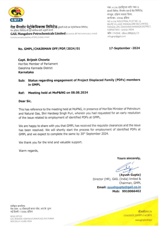 ಈ ಮೂಲಕ ಬಹುದಿನಗಳ ಜೆಬಿಎಫ್ ಪಿಡಿಎಫ್ ಉದ್ಯೋಗಸ್ಥರ ಗಂಭೀರ ಸಮಸ್ಯೆಯನ್ನು ದ.ಕ. ಸಂಸದ ಬ್ರಿಜೇಶ್ ಚೌಟ ಬಗೆಹರಿಸುವಲ್ಲಿ ಯಶಸ್ವಿಯಾಗಿದ್ದಾರೆ. ಈ ಸಮಸ್ಯೆಗೆ ತುರ್ತಾಗಿ ಸ್ಪಂದಿಸುವಂತೆ ಕಳೆದ ತಿಂಗಳು ಪೆಟ್ರೋಲಿಯಂ ಸಚಿವ ಹರ್ದೀಪ್ ಸಿಂಗ್ ಪುರಿ ಅವರನ್ನು ಭೇಟಿ ಮಾಡಿ ಬ್ರಿಜೇಶ್ ಚೌಟ ಮನವಿ ಮಾಡಿದ್ದರು. ಈ ಮನವಿಯ ಮೇರೆಗೆ ಅವರು, ಪೆಟ್ರೋಲಿಯಂ ಸಚಿವಾಲಯ ಕಾರ್ಯದರ್ಶಿ ಪಂಕಜ್ ಜೈನ್, ಗೈಲ್ ಸಿಎಂಡಿ ಸಂದೀಪ್ ಗುಪ್ತಾ ಹಾಗೂ ಜಿಎಂಪಿಎಲ್ ಅಧ್ಯಕ್ಷ ಆಯುಷ್ ಗುಪ್ತಾರೊಂದಿಗೆ ಸಭೆ ನಡೆಸಿದ್ದರು. ಇದೀಗ ಬಗ್ಗೆ ಬ್ರಿಜೇಶ್ ಚೌಟ ಅವರಿಗೆ ಪತ್ರ ಬರೆದಿರುವ ಗೇಲ್ ಇಂಡಿಯಾದ ನಿರ್ದೇಶಕ ಹಾಗೂ ಜಿಎಂಪಿಎಲ್ ಅಧ್ಯಕ್ಷ ಆಯುಷ್ ಗುಪ್ತಾ “ಜಿಎಂಪಿಎಲ್ಗೆ ಜೆಬಿಎಫ್ಪಿಎಲ್ ಪಿಡಿಎಫ್ ಸಮಸ್ಯೆ ಬಗ್ಗೆ ಮನವಿ ಬಂದಿದ್ದು ಅದನ್ನು ಆದ್ಯತೆ ಮೇರೆಗೆ ಬಗೆಹರಿಸಲಾಗುತ್ತಿದ್ದು, ಸೆ.30ರೊಳಗೆ ಈ ಪ್ರಕ್ರಿಯೆ ಪೂರ್ಣಗೊಳಿಸುವುದಾಗಿ” ಭರವಸೆ ನೀಡಿದ್ದಾರೆ. ಈ ಹಿನ್ನಲೆಯಲ್ಲಿ ಮತ್ತೆ ಉದ್ಯೋಗ ಕಲ್ಪಿಸಿ ಕೊಟ್ಟ ಸಂಸದ ಬ್ರಿಜೇಶ್ ಚೌಟರನ್ನು ಸಂತ್ರಸ್ತರು ಭೇಟಿ ಮಾಡಿ ಅಭಿನಂದನೆ ಸಲ್ಲಿಸಿದ್ದಾರೆ.