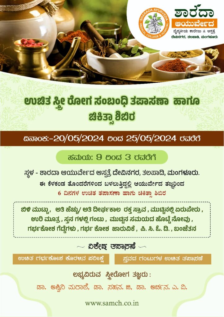 ಮಂಗಳೂರು: ಶಾರದಾ ಆಯುರ್ವೇದ ವೈದ್ಯಕೀಯ ಕಾಲೇಜು ಮತ್ತು ಆಸ್ಪತ್ರೆ ದೇವಿನಗರ ತಲಪಾಡಿ, ಮಂಗಳೂರು ಇದರ ನೇತ್ರತ್ವದಲ್ಲಿ ಉಚಿತ ಸ್ತ್ರೀ ರೋಗ ಸಂಬಂಧಿ ತಪಾಸಣಾ ಹಾಗೂ ಚಿಕಿತ್ಸಾ ಶಿಬಿರವು ದಿನಾಂಕ ಮೇ 20 ರಿಂದ ಮೇ 25 ರ ವರೆಗೆ ಸಮಯ ಬೆಳಿಗ್ಗೆ 9 ರಿಂದ ಸಂಜೆ 3ರ ತನಕ ಶಾರದಾ ಆಯುರ್ವೇದ ವೈದ್ಯಕೀಯ ಕಾಲೇಜು ತಲಪಾಡಿಯಲ್ಲಿ ನಡೆಯಲಿದೆ.