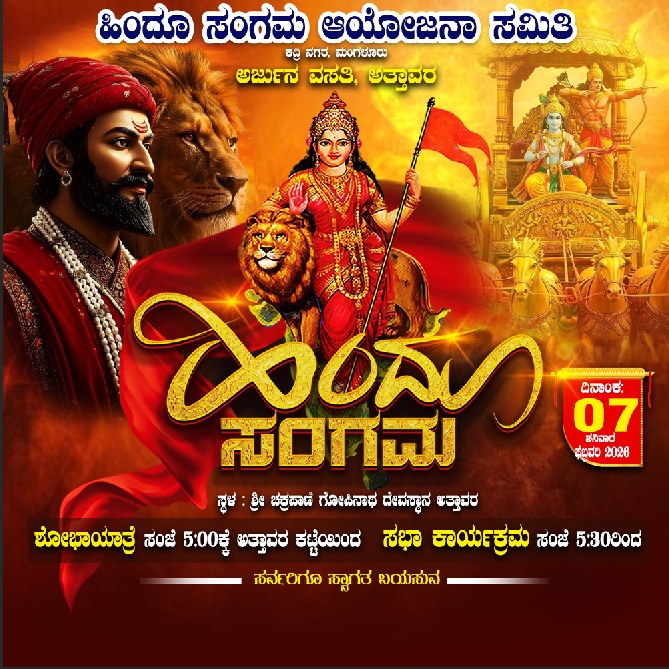ಮಂಗಳೂರು: ನಾವೆಲ್ಲಾ ಹಿಂದೂ ನಾವೆಲ್ಲಾ ಒಂದು’ ಘೋಷವಾಕ್ಯದಡಿ ಹಿಂದೂ ಸಂಗಮ ಆಯೋಜನ ಸಮಿತಿ ಕದ್ರಿ, ಅರ್ಜುನ ವಸತಿ ಅತ್ತಾವರ ವತಿಯಿಂದ ಫೆ.7ರಂದು ಅತ್ತಾವರದ ಶ್ರೀ ಚಕ್ರಪಾಣಿ ಗೋಪಿನಾಥ ಕ್ಷೇತ್ರದಲ್ಲಿ ಬೃಹತ್ ಹಿಂದು ಸಂಗಮ ಆಯೋಜಿಸಲಾಗಿದೆ.
