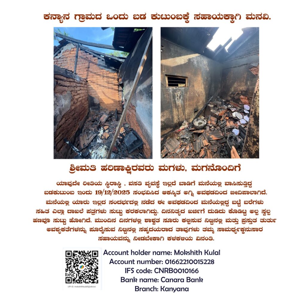 ವಿಟ್ಲ: ಮನೆಗೆ ಶಾರ್ಟ್ ಸರ್ಕ್ಯೂಟ್ ನಿಂದ ಬೆಂಕಿ ಹತ್ತಿ ಸುಟ್ಟು ಬಸ್ಮವಾದ ಘಟನೆ ಕನ್ಯಾನದಲ್ಲಿ ನಡೆದಿದೆ.