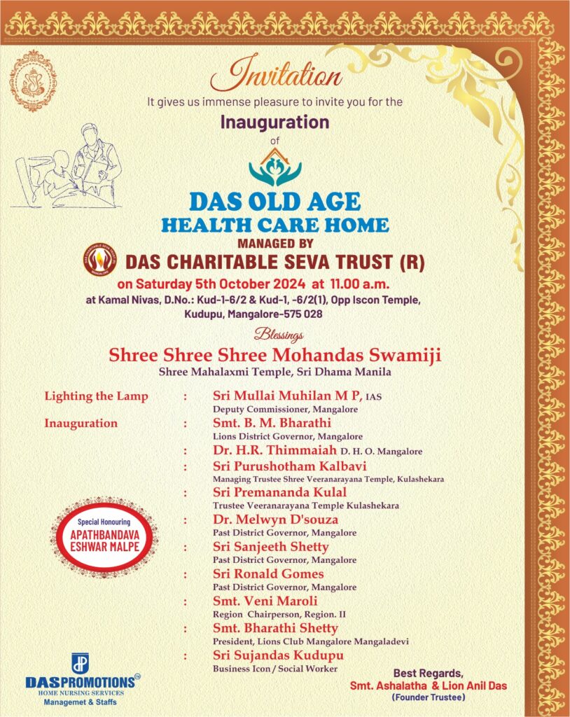 ಮಂಗಳೂರು: ದಾಸ್ ಚಾರಿಟೇಬಲ್ ಸೇವಾ ಟ್ರಸ್ಟ್ ನ ಮೂಲಕ ಕಳೆದ 12 ವರ್ಷಗಳಿಂದ ಸೇವಾ ಕ್ಷೇತ್ರದಲ್ಲಿ ಸಮಾಜಮುಖಿ ಕೆಲಸಗಳಲ್ಲಿ ತೊಡಗಿಸಿಕೊಂಡಿರುವ ಟ್ರಸ್ಟ್ ನ ವತಿಯಿಂದ ನಡೆಸಲ್ಪಡುವ ಎರಡನೇ ಸೇವಾ ಯೋಜನೆ ದಾಸ್ ಒಲ್ಡ್ ಏಜ್ ಹೆಲ್ತ್ ಕೇರ್ ಹೋಂ ಇದೀಗ ಕುಡುಪುವಿನ ಕಮಲ ನಿವಾಸ ಕಟ್ಟಡದಲ್ಲಿ ಪೂಜ್ಯ ಶ್ರೀ ಶ್ರೀ ಶ್ರೀ ಮೋಹನ್ ದಾಸ ಸ್ವಾಮೀಜಿ ಶ್ರೀ ಕ್ಷೇತ್ರ ಮಾಣಿಲ ಇವರ ದಿವ್ಯ ಆಶೀರ್ವಚನದೊಂದಿಗೆ ಹಾಗೂ ದ.ಕ ಜಿಲ್ಲಾಧಿಕಾರಿ ಮುಲ್ಲೈ ಮುಗಿಲನ್ ಅವರ ದಿವ್ಯ ಹಸ್ತದಲ್ಲಿ ಉದ್ಘಾಟನೆಗೊಳ್ಳಲಿದೆ.