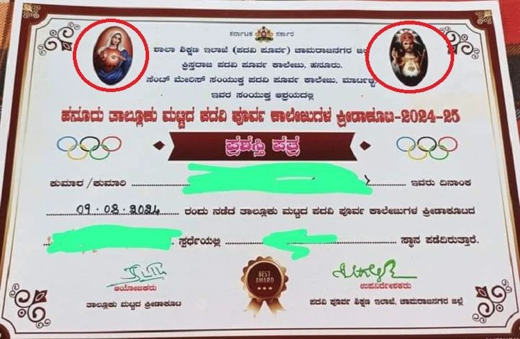 ಶಿಕ್ಷಣ ಇಲಾಖೆಯು ಕ್ರೀಡಾ ಕೂಟದ ಪ್ರಶಸ್ತಿ ಪತ್ರದಲ್ಲಿ ಕ್ರೈಸ್ತ ಧರ್ಮದ ಆಧಾರಕರ ಚಿತ್ರವನ್ನು ಬಳಸುವ ಮೂಲಕ ಇದೀಗ ಮತ್ತೊಮ್ಮೆ ವಿವಾದಕ್ಕೆ ಕಾರಣವಾಗಿದೆ.