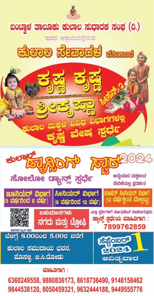 ಕುಲಾಲ ಮಕ್ಕಳಿಗೆ ಕುಲಾಲ ಡ್ಯಾನ್ಸ್ ಸ್ಟಾರ್ 2024 ಹಮ್ಮಿಕೊಂಡಿದ್ದು ಭಾಗವಹಿಸುವವರು ಗೂಗಲ್ ಫಾರಮ್ ಭರ್ತಿ ಮಾಡಿ ಸ್ಪರ್ಧೆಗೆ ಬಾಗವಹಿಸಬಹುದು .