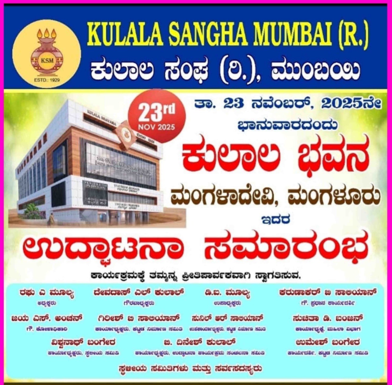 ಮಂಗಳೂರಿನ ಮಂಗಳಾದೇವಿ ಸಮೀಪ ಮುಂಬಯಿ ಕುಲಾಲ ಸಂಘದ ಒಡೆತನದಲ್ಲಿ ಬಹುಕೋಟಿ ವೆಚ್ಚದಲ್ಲಿ ನಿರ್ಮಾಣಗೊಂಡ ಕುಲಾಲ ಭವನವು ನವೆಂಬರ್ 23ರಂದು ಲೋಕಾರ್ಪಣೆಗೊಳ್ಳಲಿದೆ
