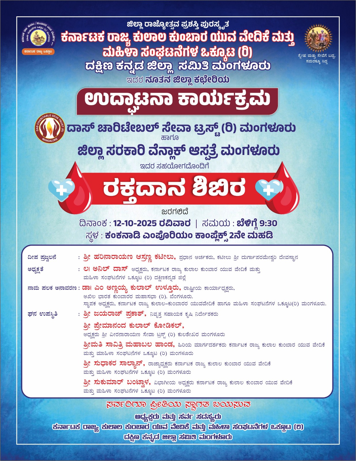 ಮತ್ತು ದಾಸ್ ಚಾರಿಟಬಲ್ ಸೇವಾ ಟ್ರಸ್ಟ್ (ರಿ.) ಮಂಗಳೂರು, ಜಿಲ್ಲಾ ಸರಕಾರಿ ವೆನ್ಲಾಕ್ ಆಸ್ಪತ್ರೆ ಮಂಗಳೂರು ಇದರ ಸಹಯೋಗದೊಂದಿಗೆ ಬೃಹತ್ ರಕ್ತದಾನ ಶಿಬಿರವು ನಡೆಯಲಿದೆ.