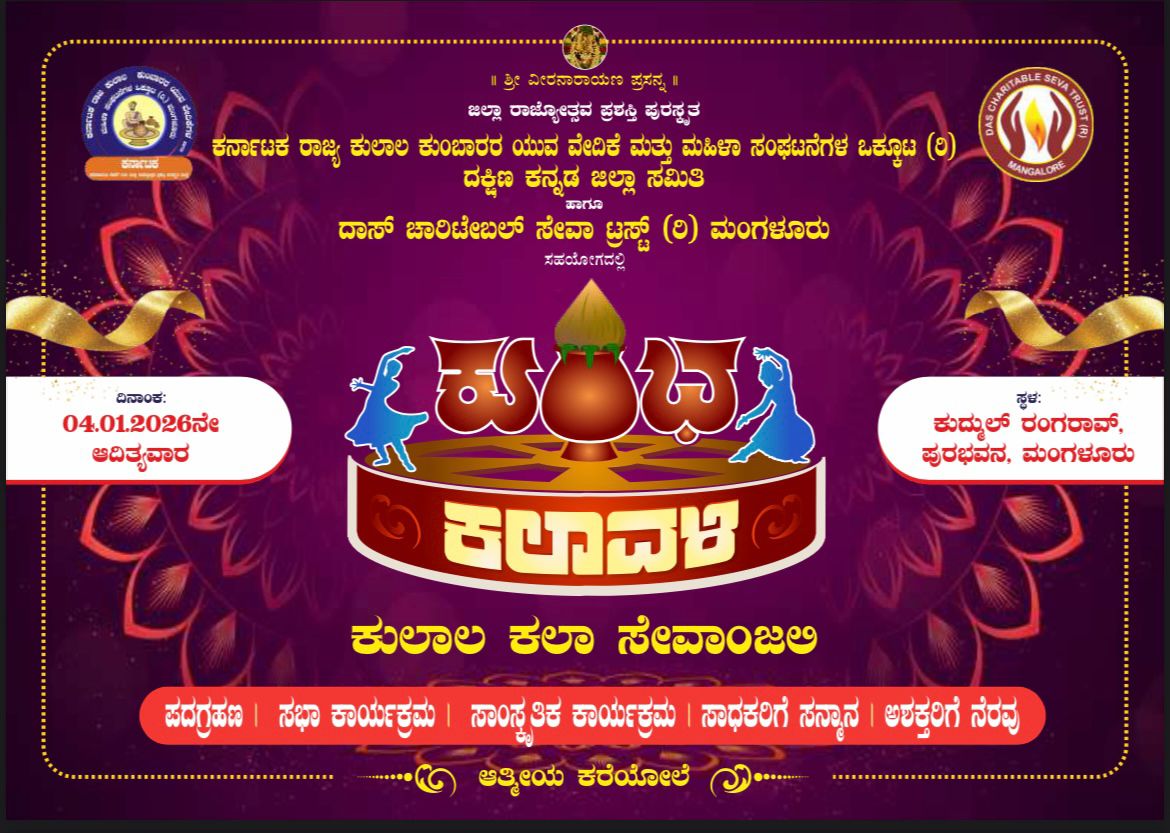 ಮಂಗಳೂರು : ಜಿಲ್ಲಾ ರಾಜ್ಯೋತ್ಸವ ಪ್ರಶಸ್ತಿ ಪುರಸ್ಕೃತ ಕರ್ನಾಟಕ ರಾಜ್ಯ ಕುಲಾಲ ಕುಂಬಾರರ ಯುವ ವೇದಿಕೆ ಮತ್ತು ಮಹಿಳಾ ಸಂಘಟನೆಗಳ ಒಕ್ಕೂಟ (ರಿ) ದಕ್ಷಿಣ ಕನ್ನಡ ಜಿಲ್ಲಾ ಸಮಿತಿ ಹಾಗೂ ದಾಸ್ ಚಾರಿಟೇಬಲ್ ಸೇವಾ ಟ್ರಸ್ಟ್ (ರಿ) ಮಂಗಳೂರು ಇದರ ಸಹಯೋಗದಲ್ಲಿ “ಕುಂಭಕಲಾವಳಿ ಕುಲಾಲ ಕಲಾ ಸೇವಾಂಜಲಿ” ಕಾಯ೯ಕ್ರಮ ಮಂಗಳೂರಿನ ಕುದ್ಮುಲ್ ರಂಗರಾವ್, ಪುರಭವನದಲ್ಲಿ ಜ. 04ರಂದು ನಡೆಯಲಿದೆ.