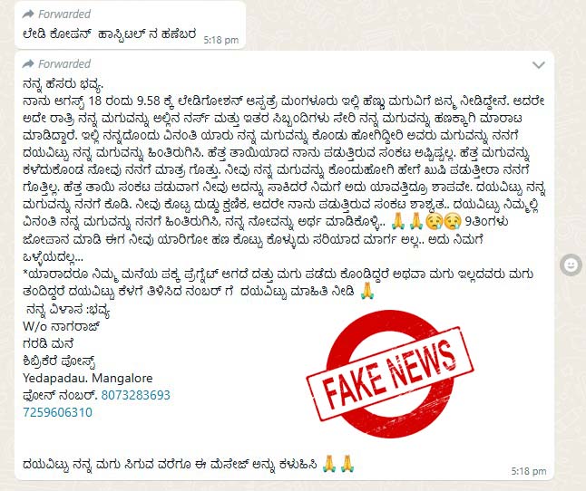 ಬಳಿಕ ಶಿಶುವಿಗೆ ಒಂದು ಕಣ್ಣುಗುಡ್ಡೆ ಇಲ್ಲದಿರುವುದನ್ನು ತಜ್ಞರು ಆಕೆಗೆ ತಿಳಿಸಿದ್ದಾರೆ. ಆ ಬಳಿಕದಿಂದ ಭವ್ಯಾ ಹಾಗೂ ಆಕೆಯ ಕುಟುಂಬಸ್ಥರು ಆ ಶಿಶುವು ತಮ್ಮದಲ್ಲವೆಂದು ಹೇಳುತ್ತಿದ್ದಾರೆ. ಮಾತ್ರವಲ್ಲ ತಮ್ಮ ಶಿಶುವವನ್ನು ಆಸ್ಪತ್ರೆಯ ಸಿಬ್ಬಂದಿ ಅದಲು ಬದಲು ಮಾಡಿದ್ದಾರೆಎಂದು ಸುಳ್ಳು ಆರೋಪವನ್ನು ಹೊರಿಸಿರುತ್ತಾರೆ. ಆದ್ದರಿಂದ ಪ್ರಕರಣ ಠಾಣೆಯ ಮೆಟ್ಟಿಲೇರಿ ಪೋಲಿಸ್ ತನಿಖೆ ನಡೆದು ನ್ಯಾಯಾಧೀಶರ ಉಪಸ್ಥಿತಿಯಲ್ಲಿ DNA ಪರೀಕ್ಷೆಯನ್ನು ಮಾಡುವ ಸಲುವಾಗಿ ಪ್ರಕ್ರಿಯೆಯನ್ನು ನಡೆಸಲಾಗಿದೆ. DNA ಪರೀಕ್ಷೆಯ ವರದಿಯನ್ನು ನೇರವಾಗಿ ತನಿಖಾಧಿಕಾರಿಗಳ ಮೂಲಕ ನ್ಯಾಯಾಲಯಕ್ಕೆ ಸಂಬಂಧಿತರು ಸಲ್ಲಿಸಿದ್ದಾರೆ. ಈ ನಡುವೆ ಮಹಿಳೆಯ ಶಿಶುವು ದಕ್ಷಿಣಕನ್ನಡ ಜಿಲ್ಲಾ ಮಕ್ಕಳ ರಕ್ಷಣಾ ಘಟಕದ ಸುಪರ್ದಿಯಲ್ಲಿರುತ್ತದೆ. ಈ ಎರಡು ದಿನಗಳಿಂಬ ಭವ್ಯಾ ತನ್ನ ಶಿಶುವನ್ನು ಸರಕಾರಿ ಲೇಡಿಗೋಶನ್ ಆಸ್ಪತ್ರೆಯ ಸಿಬ್ಬಂದಿ ಮಾರಾಟ ಮಾಡಿರುತ್ತಾರೆ ಎಂದು ಮಾನಹಾನಿಕರ ಹೇಳಿಕೆಯನ್ನು ಸಾಮಾಜಿಕ ಮಾಧ್ಯಮದಲ್ಲಿ ಬಿತ್ತರಿಸಿ ಗೊಂದಲ ಸೃಷ್ಟಿಸುತ್ತಿದ್ದಾರೆ. ಸದ್ಯ ಪ್ರಕರಣ ನ್ಯಾಯಾಲಯದ ಪರಾಮರ್ಶೆಯ ಹಂತದಲ್ಲಿರುವ ಸಂದರ್ಭ ನ್ಯಾಯಾಲಯದ ತೀರ್ಪನ್ನು ನಿರೀಕ್ಷಿಸುತ್ತಿದ್ದೇವೆ. ಆದರೂ ಮಹಿಳೆ ಸರಕಾರಿ ಲೇಡಿಗೋಶನ್ ಆಸ್ಪತ್ರೆಯ ಬಗ್ಗೆ ಮಾಡಿರುವ ಆರೋಪವು ಸಂಪೂರ್ಣವಾಗಿ ನಿರಾಧಾರವಾಗಿರುತ್ತದೆ ಎಂದು ಲೇಡಿಗೋಷನ್ ಆಸ್ಪತ್ರೆಯ ವೈದ್ಯಕೀಯ ಅಧೀಕ್ಷಕರು ಪ್ರಕಟಣೆಯಲ್ಲಿ ತಿಳಿಸಿದ್ದಾರೆ.