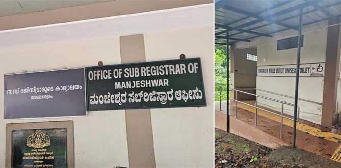 ಕಾಸರಗೋಡು ಜಿಲ್ಲೆಯ ಮಂಜೇಶ್ವರದ ಸಬ್ ರಿಜಿಸ್ಟರ್ ಕಛೇರಿ ಮುಂಭಾಗದಲ್ಲಿರುವ ಸುಸಜ್ಜಿತ ಶೌಚಾಲಯವು ಬಳಸಲು ಯೋಗ್ಯವಲ್ಲದ ಸ್ಥಿತಿಯಲ್ಲಿದ್ದು,ಜನಸಾಮಾನ್ಯರು ಸಂಬಂಧಪಟ್ಟ ಅಧಿಕಾರಿಗಳಿಗೆ ಹಿಡಿ ಶಾಪ ಹಾಕುತ್ತಿರುವ ದೃಶ್ಯ ನಿತ್ಯ ಇಲ್ಲಿ ಸರ್ವೇಸಾಮಾನ್ಯವಾಗಿದೆ.