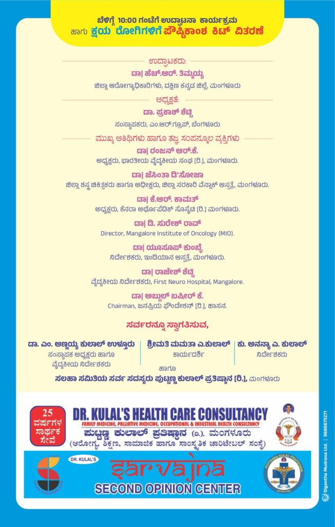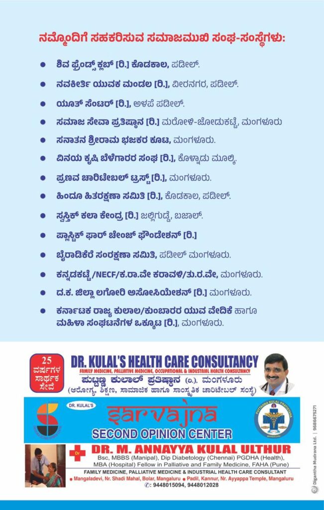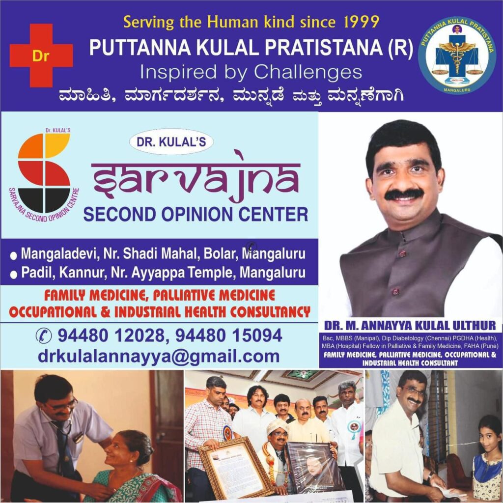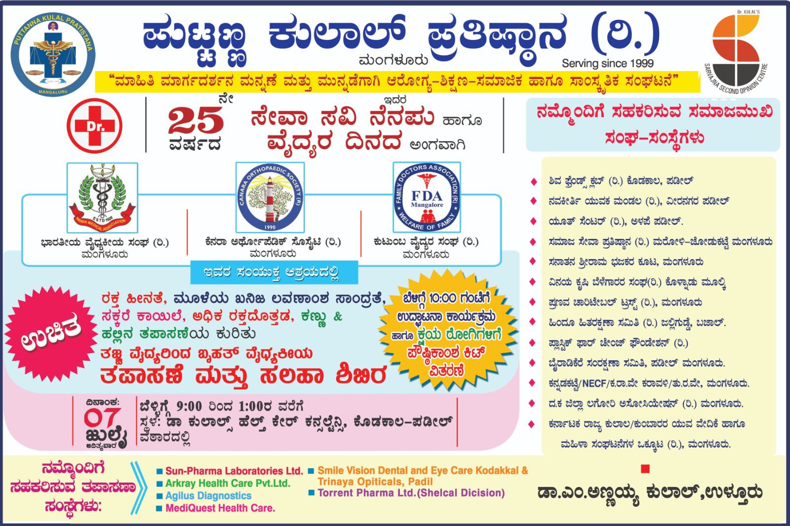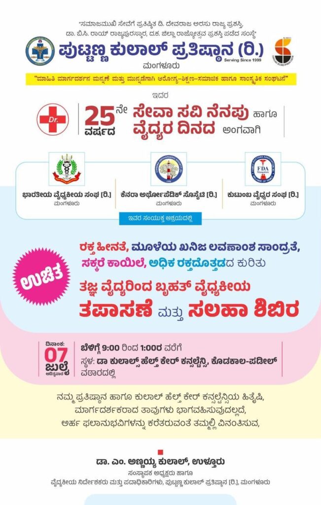 ಮಂಗಳೂರು: ಪುಟ್ಟಣ್ಣ ಕುಲಾಲ್ ಪ್ರತಿಷ್ಠಾನ (ರಿ.) ಮಂಗಳೂರು ಇದರ ನೇತ್ರತ್ವದಲ್ಲಿ 25 ನೇ ವರ್ಷದ ಸೇವಾ ಸವಿ ನೆನಪು ಹಾಗೂ ವೈದ್ಯರ ದಿನದ ಅಂಗವಾಗಿ ಭಾರತೀಯ ವೈದ್ಯಕೀಯ ಸಂಘ(ರಿ.) ಮಂಗಳೂರು, ಕೆನರಾ ಅರ್ಥೋಪೆಡಿಕ್ ಸೊಸೈಟಿ (ರಿ.) ಮಂಗಳೂರು ಮತ್ತು ಕುಟುಂಬ ವೈದ್ಯರ ಸಂಘ (ರಿ.) ಮಂಗಳೂರು ಇವರ ಸಂಯುಕ್ತ ಆಶ್ರಯದಲ್ಲಿ ಉಚಿತ ತಜ್ಞ ವೈದ್ಯರಿಂದ ಬೃಹತ್ ವೈದ್ಯಕೀಯ ತಪಾಸಣೆ ಮತ್ತು ಸಲಹಾ ಶಿಬಿರವು ದಿನಾಂಕ ಜುಲೈ 7 ರಂದು ಬೆಳಿಗ್ಗೆ 9 ರಿಂದ ಮಧ್ಯಾಹ್ನ 1 ಗಂಟೆಯ ವರೆಗೆ ಡಾ.ಕುಲಾಲ್ಸ್ ಹೆಲ್ತ್ ಕೇರ್ ಕನ್ಸಲ್ಟೆನ್ಸಿ, ಕೊಡಕಾಲ-ಪಡೀಲ್ ಇಲ್ಲಿ ನಡೆಯಲಿದೆ.