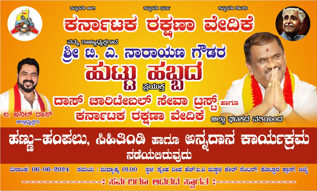 ಕರ್ನಾಟಕ ರಕ್ಷಣಾ ವೇದಿಕೆ ರಾಜ್ಯಾಧ್ಯಕ್ಷರಾದ ಟಿ. ಎ. ನಾರಾಯಣ ಗೌಡ ರ ಹುಟ್ಟುಹಬ್ಬದ ಪ್ರಯುಕ್ತ ದಾಸ್ ಚಾರಿಟೇಬಲ್ ಸೇವಾ ಟ್ರಸ್ಟ್ ಹಾಗೂ ಕರ್ನಾಟಕ ರಕ್ಷಣಾ ವೇದಿಕೆ ಜಿಲ್ಲಾ ಘಟಕ ದ ವತಿಯಿಂದ ನಗರದ ಸ್ನೇಹ ದೀಪ ಮಕ್ಕಳ (HIV ) ಕೇರ್ ಸೆಂಟರ್ ನಲ್ಲಿ ಮದ್ಯಾಹ್ನ ಅನ್ನದಾನ ಮತ್ತು ಸಿಹಿ ತಿಂಡಿ ವಿತರಣೆ ಮಾಡಿ ಮಕ್ಕಳ ಜೊತೆಯಲ್ಲಿ ಹುಟ್ಟುಹಬ್ಬದ ಸಂಭ್ರಮಾಚಾರಣೆ ಯನ್ನು ಅರ್ಥ ಪೂರ್ಣ ವಾಗಿ ಆಚರಿಸಲಾಯಿತು.