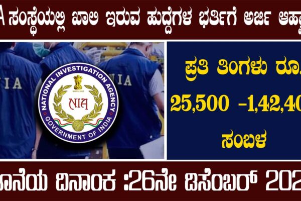 ದೇಶದ ಪ್ರತಿಷ್ಠಿತ ತನಿಖಾ ಸಂಸ್ಥೆ (ಎನ್‌ಐಎ) ಮತ್ತು ಕೇಂದ್ರ ಗೃಹ ಸಚಿವಾಲಯದ ಅಡಿಯಲ್ಲಿ ಕಾರ್ಯನಿರ್ವಹಿಸುತ್ತಿರುವ ರಾಷ್ಟ್ರೀಯ ತನಿಖಾ ಸಂಸ್ಥೆ (ಎನ್‌ಐಎ) ಖಾಲಿ ಇರುವ ಇನ್ಸ್ಪೆಕ್ಟರ್ ಮತ್ತು ಹೆಡ್ ಕಾನ್ಸ್ಟೇಬಲ್ ಹುದ್ದೆಗಳನ್ನು ಭರ್ತಿ ಮಾಡಲು ಅರ್ಹ ಮತ್ತು ಆಸಕ್ತ ಅಭ್ಯರ್ಥಿಗಳಿಂದ ಅರ್ಜಿಗಳನ್ನು ಆಹ್ವಾನಿಸಿದೆ. ಈ ಹುದ್ದೆಗಳಿಗೆ ಅರ್ಜಿ ಸಲ್ಲಿಸುವ ಮೊದಲು, ಅಭ್ಯರ್ಥಿಗಳು ಪೋಸ್ಟ್ ವಿವರಗಳು, ವೇತನ ಶ್ರೇಣಿ, ವಯಸ್ಸಿನ ಮಿತಿ, ಶೈಕ್ಷಣಿಕ ಅರ್ಹತೆ, ಅರ್ಜಿ ಶುಲ್ಕ ಮತ್ತು ಆಯ್ಕೆ ಪ್ರಕ್ರಿಯೆ ಸೇರಿದಂತೆ ಸಂಪೂರ್ಣ ಮಾಹಿತಿಯನ್ನು ತಿಳಿದುಕೊಳ್ಳಬೇಕು. ಹುದ್ದೆಗಳ ವಿವರ…