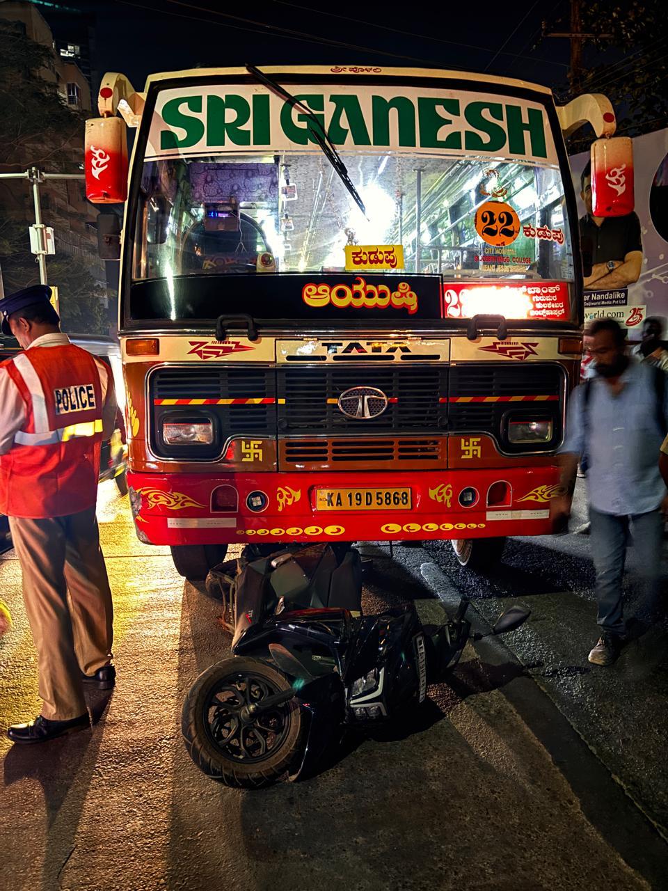 ಈ ವೇಳೆ, ಕದ್ರಿ ಶಿವಭಾಗ್ ಕಡೆಯಿಂದ ನಂತೂರು ಕಡೆಗೆ ಸಾಗುತ್ತಿದ್ದ ಬಸ್ ತಾಗಿದ್ದು ಹಿಂಬದಿಯಿದ್ದ ಸವಾರೆ ನೆಲಕ್ಕೆ ಬಿದ್ದಿದ್ದಾರೆ. ಈ ವೇಳೆ, ಬಸ್ ಆಕೆಯ ಹೊಟ್ಟೆಯ ಮೇಲೆ ಹರಿದಿದ್ದು ಗಂಭೀರ ಗಾಯಗೊಂಡಿದ್ದಾರೆ. ಕೂಡಲೇ ಎಜೆ ಆಸ್ಪತ್ರೆಗೆ ಒಯ್ದಿದ್ದು ಅಷ್ಟರಲ್ಲಿ ಆಕೆ ಅಸುನೀಗಿದ್ದಾರೆ.