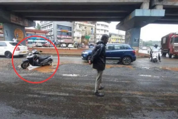 ಮಂಗಳೂರು: ರಸ್ತೆ ಗುಂಡಿಗೆ ಬಿದ್ದ ಸವಾರ – ಗುಂಡಿಯಲ್ಲೇ ಸ್ಕೂಟರ್ ಇಟ್ಟು ಪ್ರತಿಭಟನೆ..!