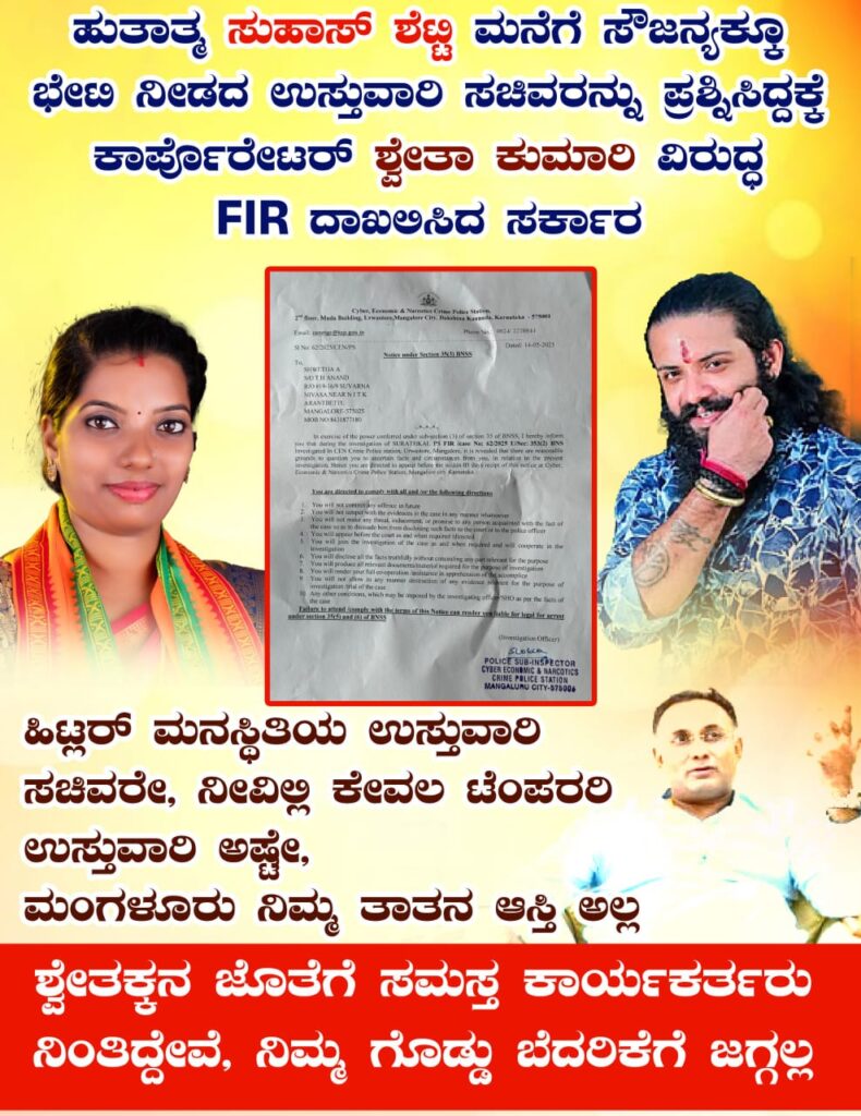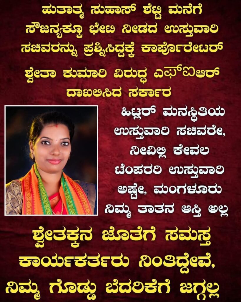 ಸುಹಾಸ್ ಶೆಟ್ಟಿ ಹತ್ಯೆ ಪ್ರಕರಣದಲ್ಲಿ ಘಟನಾ ಸ್ಥಳದಲ್ಲಿ ಕಾಣಿಸಿಕೊಂಡ ಬುರ್ಖಾಧಾರಿ ಮಹಿಳೆಯರನ್ನು ಯಾಕೆ ಬಂಧಿಸಿಲ್ಲ ಎಂದು ಪ್ರಶ್ನಿಸಿ ಜಿಲ್ಲಾ ಉಸ್ತುವಾರಿ ಸಚಿವ ದಿನೇಶ್ ಗುಂಡೂರಾವ್ ಅವರನ್ನು ಉದ್ದೇಶಿಸಿ ಸಾಮಾಜಿಕ ಜಾಲತಾಣಗಳಲ್ಲಿ ಪ್ರಶ್ನಿಸಿದ್ದ ಬಿಜೆಪಿ ಮಹಿಳಾಮೋರ್ಚಾ ರಾಜ್ಯ ಕಾರ್ಯದರ್ಶಿ, ಮಾಜಿ ಕಾರ್ಪೊರೇಟರ್ ಶ್ವೇತಾ ಪೂಜಾರಿ ಮೇಲೆ ಎಫ್ಐಆರ್ ದಾಖಲಾಗಿದೆ.