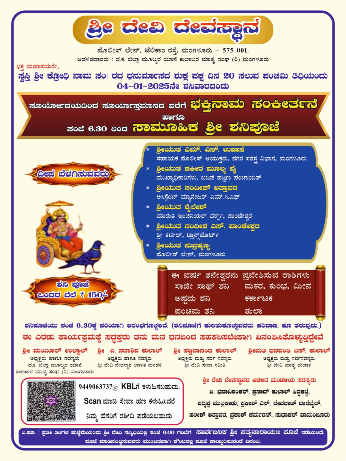ಮಂಗಳೂರು: ಶ್ರೀ ದೇವಿ ದೇವಸ್ಥಾನ ಪೋಲಿಸ್ ಲೈನ್ ಮಂಗಳೂರು ಇಲ್ಲಿ ಜನವರಿ 4 ರಂದು ಸೂರ್ಯೋದಯದಿಂದ ಸೂರ್ಯಾಸ್ತಮಾನದ ವರೆಗೆ ಭಕ್ತಿನಾಮ ಸಂಕೀರ್ತನೆ ಹಾಗೂ ಸಂಜೆ 6:30 ರಿಂದ ಸಾಮೂಹಿಕ ಶ್ರೀ ಶನಿಪೊಜೆ ನಡೆಯಲಿದೆ.