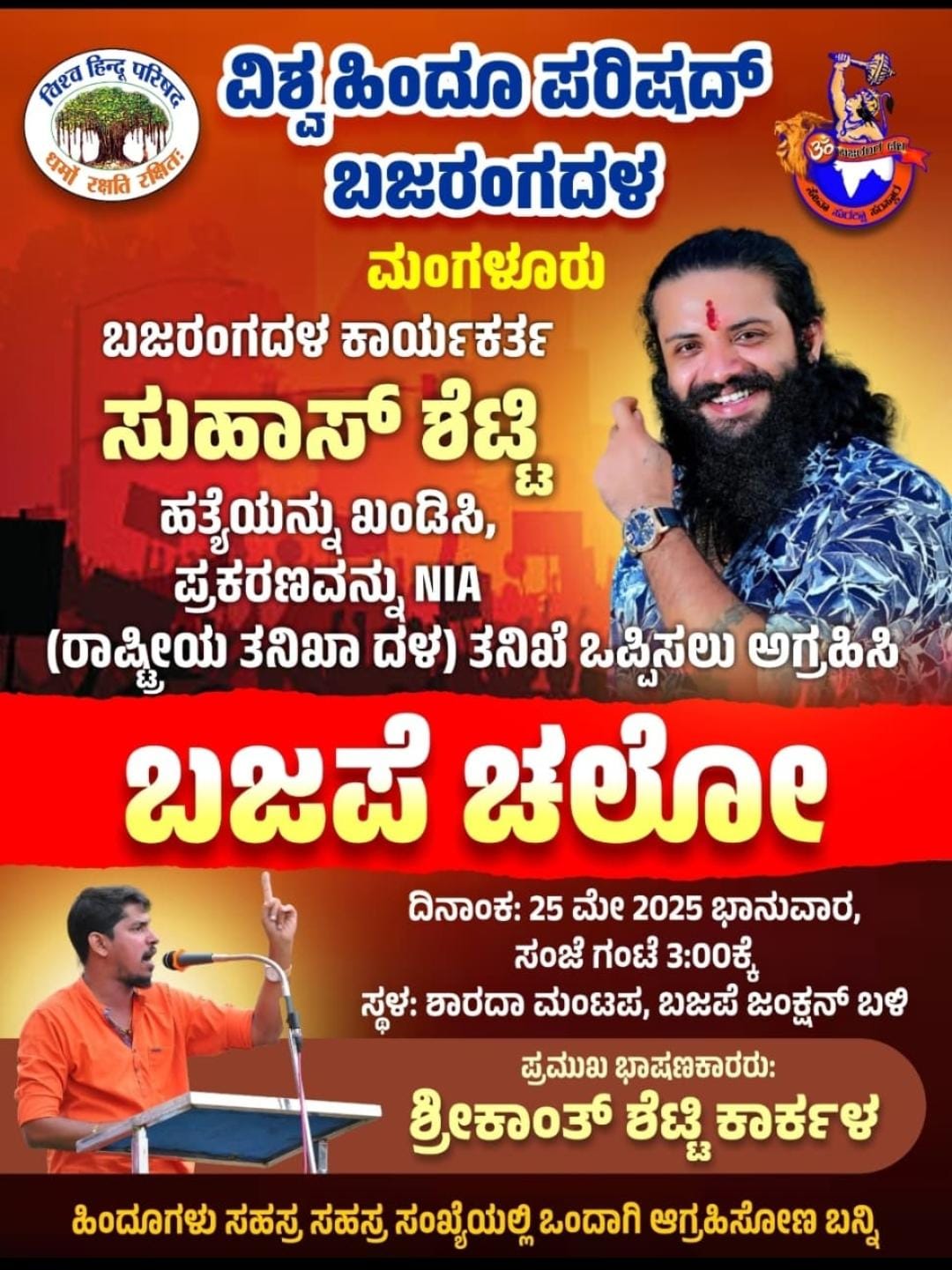 ಮಂಗಳೂರು: ಹಿಂದೂ ಕಾರ್ಯಕರ್ತರ ಸುಹಾಸ್ ಶೆಟ್ಟಿ ಕೊಲೆ ಪ್ರಕರಣ ಎನ್ ಐಎ ಗೆ ನೀಡಲು ಆಗ್ರಹಿಸಿ ಮೇ 25 ರಂದು ಬಜಪೆಯಲ್ಲಿ ಜನಾಗ್ರಹ ಸಭೆ ನಡೆಸಲು ವಿಶ್ವ ಹಿಂದೂ ಪರಿಷತ್ ಭಜರಂಗದಳ ತಿಳಿಸಿದೆ.