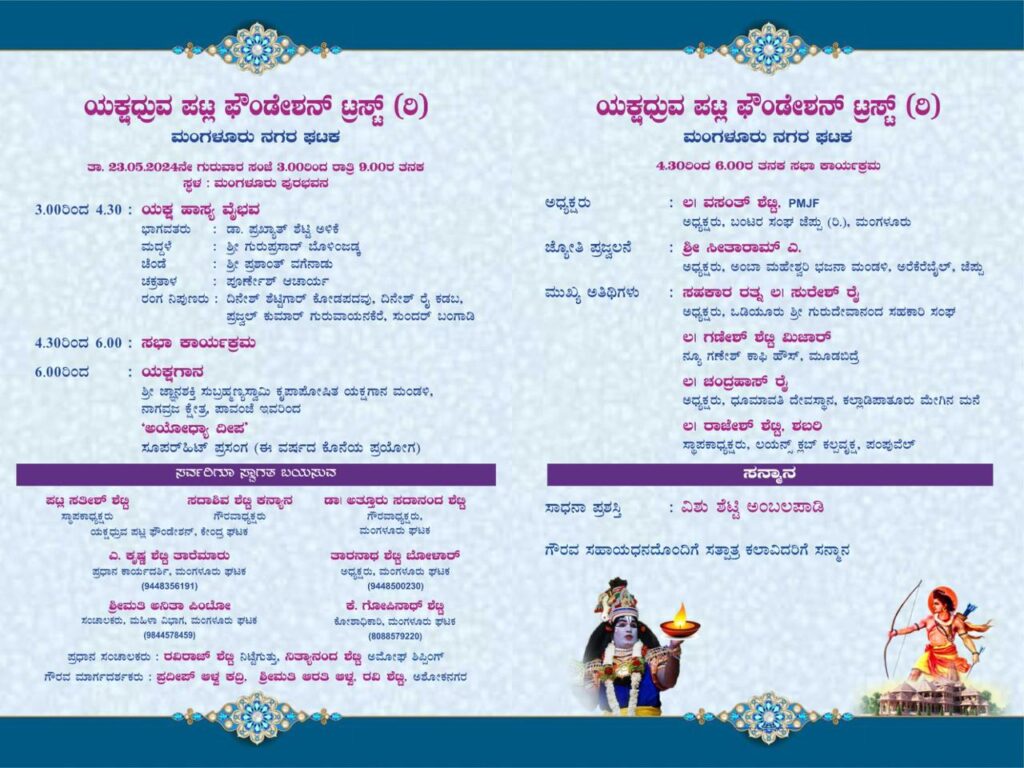 ಮಂಗಳೂರು : ಯಕ್ಷಧ್ರುವ ಪಟ್ಲ ಫೌಂಡೇಶನ್ ಟ್ರಸ್ಟ್ (ರಿ.) ಇದರ ಮಂಗಳೂರು ನಗರ ಘಟಕದ ‘ಪಂಚಮ ವಾರ್ಷಿಕ ಸಂಭ್ರಮ’ವು ಇಂದು (ದಿನಾಂಕ 23-05-2024) ರಂದು ಸಂಜೆ ಗಂಟೆ 3-00ರಿಂದ ಮಂಗಳೂರಿನ ಪುರಭವನದಲ್ಲಿ ನಡೆಯಲಿದೆ.